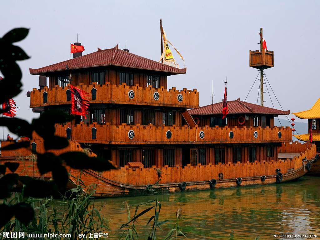 [曹營水旱寨]赤壁之戰(zhàn)是我國古代軍事上以少勝多,以弱勝強(qiáng)的著名之一,也是決定三國時(shí)代魏、蜀、吳三足鼎立的關(guān)健一戰(zhàn),而接下來我們參觀的曹營水旱寨就是<<三國演義>>中火燒赤壁的重要拍攝場(chǎng)景。整個(gè)曹營東西長(zhǎng)300米,南北寬100米,采用木結(jié)構(gòu)和水泥仿木結(jié)構(gòu)建造,進(jìn)入寨門后,我們登上三層高的曹操點(diǎn)將臺(tái),點(diǎn)將臺(tái)兩側(cè)戰(zhàn)鼓矗立,旌旗飛揚(yáng),站在點(diǎn)將臺(tái)舉目遠(yuǎn)眺,水寨風(fēng)光盡收眼底,整個(gè)水寨建在太湖邊上,當(dāng)時(shí)“火燒赤壁”這場(chǎng)戲,就在此拍攝,據(jù)統(tǒng)計(jì),在拍攝這場(chǎng)戲時(shí),攝制組動(dòng)用了九臺(tái)攝像機(jī)和一架直升機(jī),分別從水、陸、空三個(gè)方向同時(shí)拍攝,動(dòng)用船只72艘,大火燒掉了50多車木柴,20多噸汽柴油,并請(qǐng)來三千多名群眾演員參加拍攝,場(chǎng)面之大令人驚嘆。進(jìn)入水寨后,我們看到伸入湖中的一艘大船就是曹操的指揮船,走過80米長(zhǎng)的甬道 ,便來到指揮船上,底層是曹操議事廳,是曹操議事、宴請(qǐng)賓客的的地方。走出議事廳來到船頭,《三國演義》中曹操“橫槊賦詩”這場(chǎng)戲便是在此拍攝,當(dāng)年曹操在赤壁大戰(zhàn)之前晚宴諸將,看到鐵索連船,固若金湯,穩(wěn)如平地,認(rèn)為踏遍江南指日可待,心中大喜,便乘酒興,手提鐵槊,在此賦出“對(duì)酒當(dāng)歌,人生幾何”的《短行歌》。站在船頭,一碧萬頃的太湖盡收眼底,在此便能領(lǐng)略“太湖美,美就美在太湖水“的意境,太湖總面積為2400平方公里,號(hào)稱“三萬六千頃”,相當(dāng)于兩個(gè)香港那么大,同時(shí)它也是中國五大淡水湖之一,它的發(fā)源地是浙江天目山、茅山,經(jīng)吳江、黃浦江流入東海。二樓為曹操的書房,正中一個(gè)篆體的“曹”字,桌上放的是曹操發(fā)號(hào)施令用的令牌,兩邊墻上的劇照就是電視導(dǎo)劇中“火燒赤壁”的場(chǎng)景。