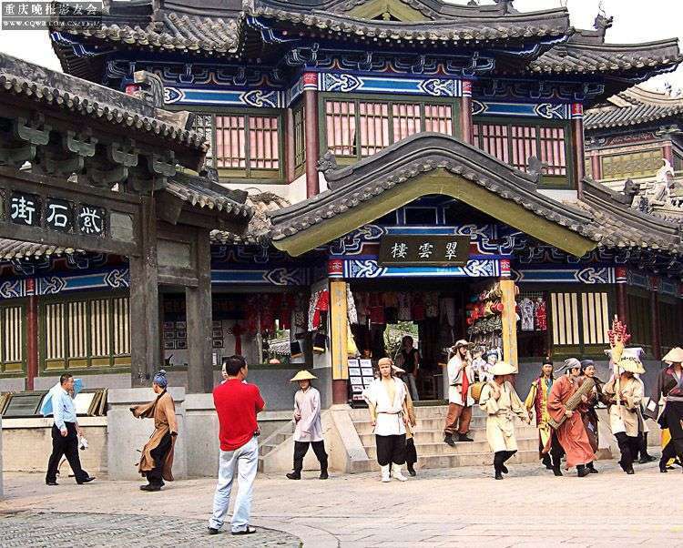 走到這條街上,我們立即能感受到濃厚的生活氣息和商業(yè)氣息,這里有吉祥賭坊、朱繼酒店、武大郎炊餅店、王婆茶館、鄭屠肉鋪,這條街雖然不長,但有這些民宅、店鋪的融入已將這條街點(diǎn)綴的興趣大增。大家都知道,中國的古建筑以木結(jié)構(gòu)為其主要特點(diǎn),紫石街上的這些店鋪用的都是地道的土木材料,市進(jìn)民宅,店鋪?zhàn)鞣簧势綄?shí),刻意作舊,這條街上,我們看到不少磨損的框柱,有煙塵蛛網(wǎng)的層頂,還有漏痕斑駁的墻壁,這些都是拍攝時(shí)為了追求真實(shí)感而有意做成的。這個(gè)吉祥賭坊門上有一幅比較有趣的門聯(lián),各位游客讀的出嗎?左邊是:趙孫李不請只認(rèn)錢,右邊是:琴棋書畫皆有不言書。賭坊里出售的是各種賭具,內(nèi)部也可供游客休息。