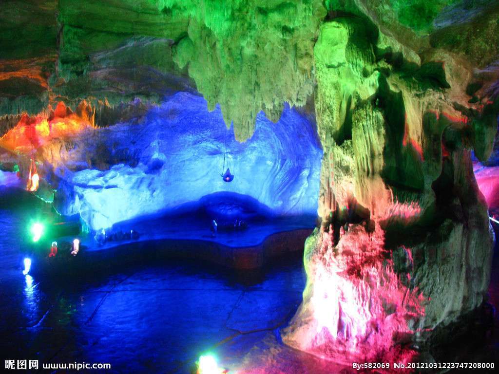水洞原是一條古老的地下河,長120米,彎彎曲曲有三個轉(zhuǎn)彎,水面最寬處達(dá)6米,最深處將近5米,前面滴水蓮蓬頭,各位要保護(hù)好自己的頭,千萬不要撞個大包帶回去作留念?!八^”是水洞巖層最低處,請把頭低下,前面水中倒映,五彩繽紛,四壁生輝,水石一色,好似來到神話里的“水晶宮”中。