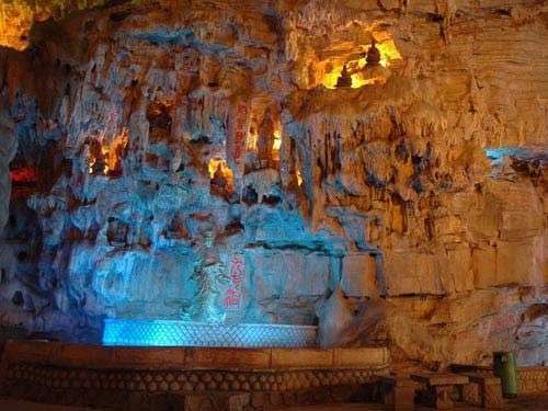 現(xiàn)在,大家來到了洞口,一塊七米多高的巨石擋住了去路,你可別小看這塊石頭,它已經(jīng)是三萬多歲的高齡了,而且是每五十年長一公分,一點一點長高的。因為洞頂巖層滴下的水中含有豐富的碳酸鈣,在一定的溫度和壓力下,這些碳酸鈣就逐漸凝固起來,“滴水穿石”在這兒變成了“滴水長石”。遺憾的是,1957年洞口出現(xiàn)塌方,加固后的洞頂不再滴水,巨石停止了生長。它好像黃河激流中的中流砥柱,因此稱為“砥柱峰”,古時也叫“小須彌山”。好,讓我們繞過巨石,進(jìn)洞探奇。