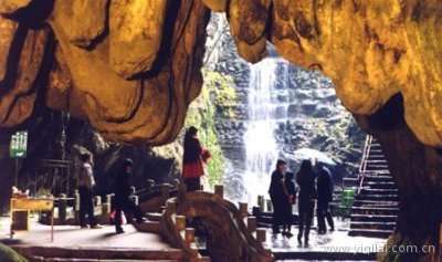 “梯口”是下洞的進(jìn)口,從這里下去要經(jīng)過105級臺階,有五層樓深。中洞和下洞原來只有小小的溶洞相通。為了使游客在游覽時不走回頭路,從1925年開始,每天有20名工匠在這里開鑿,整整用了10年時間才打通。在這途中還要經(jīng)過四道門:風(fēng)雷門、波濤門、金鼓門、萬馬門。每當(dāng)下雨時,下雨聲和下洞的流水聲經(jīng)過折射傳到這里,產(chǎn)生共鳴,站的角度不同,能聽到四種不同的聲音,風(fēng)雷交加,波濤滾滾,金鼓齊鳴,萬馬奔騰。今天外面是晴空萬里,沒有下雨的樣子。假如哪位朋友有雅興的話,不如下雨天來領(lǐng)略一下這其中的詩意。
